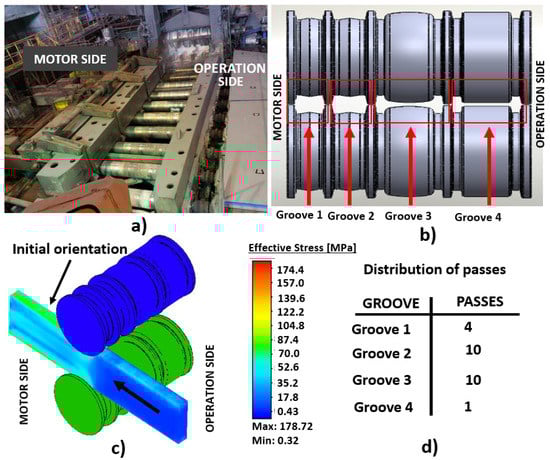 (a) Reversible hot mill; (b) location and geometry of each groove of the work roll; (c) initial orientation of the beam on the mill; (d) distribution of passes for each groove.