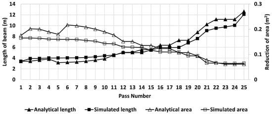 The main objective of the present work is to validate the numerical model comparing the results of the simulations with those measured in-plant. The first step is to compare the calculated length and area of cross-section per pass with the predicted by the numerical model considering a constant temperature of the beam, Figure 4 shows the results obtained.