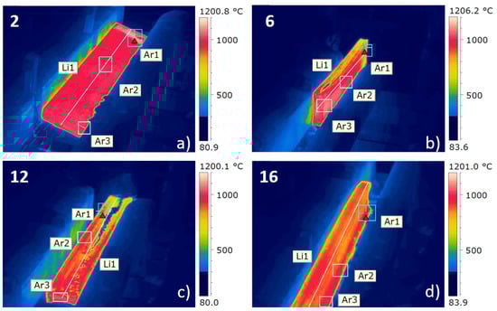 Representative thermographic images taken during the hot rolling process: (a) pass 2; (b) pass 6; (c) pass 12; (d) pass 16.The scale of the figures have been improved.