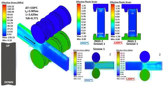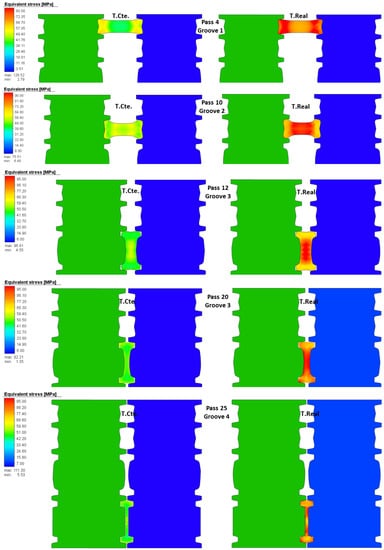 Figure 7 contains a lot of information, for example it is possible to observe the isometric of the virtual model representing the effective stress of the pass 2. It is possible to observe the thermal gradient between the ideal temperature and the real temperature (158 ), the final length predicted by the numerical model (3905 mm), the final length calculated analytically (3429 mm), and the percentage of reduction in area (0.771%). The upper right part of the image shows the comparison of the effective plastic strain for both cases (constant temperature and real temperature). Furthermore, finally, in the lower right part, the values of the effective stress are shown for both cases. An important feature of the numerical simulation is the posibility of obtaining information during the rolling process such as the effective stress in a cross-section. Figure 8 shows the distribution of effective stress in the central cross-section of the beam during the rolling of selected passes for the simulation at constant and real temperature. Note that measurements of this kind are imposible to obtain in-plant because it is not possible to section the beam during the rolling. The passes in Figure 8 were selected to show the rolling in the four grooves: pass 4 is performed in groove 1, pass 10 in groove 2, passes 12 and 20 in groove 3 (in this groove the desired I-profile is almost achieved), and pass 25 in groove 4.
