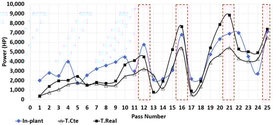 The evolution of the power to accomplish the rolling of the beam is an important parameter, specifically the maximum power is monitored in-plant to avoid reaching the limits of the electric motors moving the rolls. Excesive power is not desirable during the process because it could damage the motors, mechanical parts or compromise the power supply of the facility. For the simulations, the power required to roll the steel can be calculated using Equation (11) [19].
