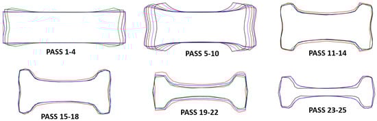 The simulations allow to examine the cross-sectional area of the beam after each pass to visualize the evolution of the geometry. Figure 12 shows the cross-section at the center of the beam for each pass for the simulation at real temperature. The cross-sections away from the center and those for the simulation at constant temperature are very similar to those of Figure 12, they are not shown for sake of clarity. Similar measurements in-plant would be expensive and time-consuming since the process needs to be ended at the corresponding pass and 25 beams would be waisted the company only allowed to section the beam of pass 25 and the dimensions will be compared below). The objective of the first 10 passes is to roughly form an I-shape deforming the short sides of the beam. The change of geometry of the short sides of the beam is evident in Figure 12 since this is the area of contact with the rolls (see Figure 8). Passes 11–12 are performed in groove 3 and a more defined I-shape of the cross-section can be observed because the rolls start to deform the central part of the beam (see Figure 8). Then, passes 13–14 are done in groove 2 with the beam rotated deforming only slightly the short sides of the beam. These observations are consistent with the formation of the first peak in power (Figure 11) and the graph of (Figure 10). Similarly, passes 15–16 are performed in groove 3 and then the beam moves back to groove 2 for passes 17–18. Observe the significant change in the area of cross section of passes 15–18 with respecto to passes 11–14. This change in geometry is consistent with the second peak in power (Figure 11) and the graph of (Figure 10) since high power is necessary to reduce the cross-section and results in large . Passes 19–24 are performed in groove 3 with the gap gradually reducing, note the significant reduction of cross-section compared with the geometry of passes 15–18. Such change of geometry requires high power to attain the deformation of the beam and is the reason of the formation of the dominant peak in required power (Figure 11) and the graph of (Figure 10). For passes 22–23 the gap is the same and the contours of the cross-section overlap resulting in low required power and Finally, pass 25 is performed in groove 4 causing a reduction of cross-section resulting in the increase of required power and of Figure 11 and Figure 10, respectively.
