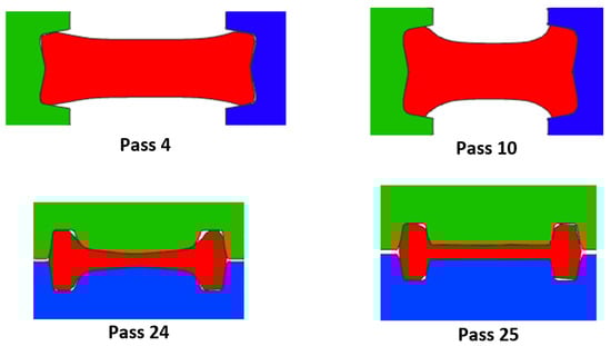 The cross-sectional area in each pass is also shown in Figure 4. The difference of the simulation and analytical calculation is clearly observed in the first 10 passes. These passes are performed using grooves 1 and 2, and only an approximate I-shape is obtained when the rolls are in contact with a relatively small surface of the beam (see Figure 5a). Thus, the difference is the result of the overestimated analytical area. However, as the process continues in grooves 3 and 4, the difference is decreasing because the beam gradually fills the groove since there is more area of contact with the rolls (see Figure 5b). The curves overlap from pass number 18, indicating an adecuate design of the groove.