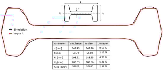 As mentioned above, only the beam of pass 25 was allowed to be sectioned to compare its geometry with the simulation’s result. Figure 14 shows the comparison of the central cross-section of the simulation and in-plant measurements. The contours of the simulations and in-plant measurements are in good agreement. The largest differences obtained are for () and (), indicating a slight overestimation of the filling of the groove in the simulation in the vertical direction (see the orientation of the beam in Figure 13). The deviation in the area of cross-section is very small (2.37 %) and considering the excellent agreement in the shape of the cross-section, it can be concluded that the simulations are very accurate to predict the geometry of the beam in the actual process, especially considering the large number of passes simulated.
