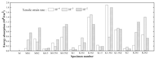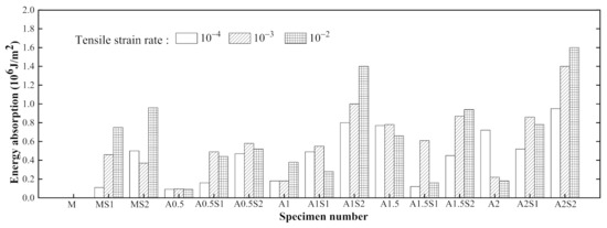 | Number | Strain Rate (s−1) | Cracking Stress (MPa) | Peak Stress (MPa) | Ultimate Strain (%) | Energy Absorption (J/m2) |