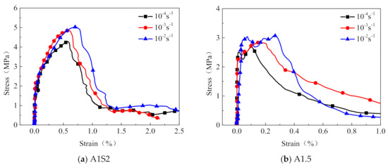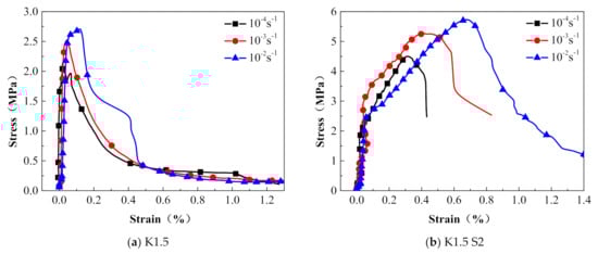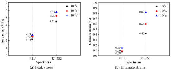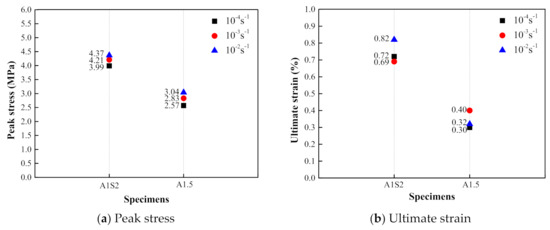 | Specimen Type | Strain Rate (s−1) | Cracking Stress (MPa) | Peak Stress (MPa) | Ultimate Strain (%) | Energy Absorption (J/m2) |