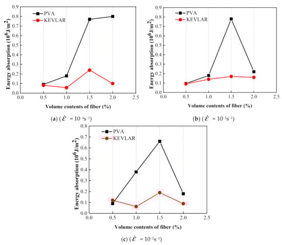 - The addition of PVA fiber and KEVLAR fiber can improve the tensile peak stress of the ECC matrix. The PVA-ECC reveals more obvious strain hardening behavior under dynamic tensile loading with the increase of fiber volume content. There is an optimum fiber volume content for the fiber-reinforced ECC from the consideration of the energy dissipation capacity. The optimum fiber volume content is 1.5% for the PVA-ECC and the KEVLAR-ECC.