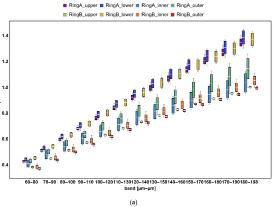 Using two-way ANOVA, height parameters are generally appropriate characterizations, which can indicate statistically if the results are different when considering hot rolling and mass-finishing individually or as their product. For all three bands, p-values for Sa and Sq were lower than 0.05. Skewness and kurtosis failed to be used as a statistical discriminator against 2nd stage processing for bandwidth equal to 50 µm. Other height parameters did not generally provide sufficient confidence levels in the analyzed case. Hybrid and volume groups exhibited strong potential for differentiation between surface topographies considering all three factors with an exception for Vm (material volume) and Vmp (peak material volume) for the narrowest and shortest bandwidth (60–80 µm) when considering both factors as a superposition. This corresponded well to the visual observation noted for geometric characterization parameters, which allowed significant enough discrimination at the finest scales. Most feature parameters could be used to differentiate surfaces taking into account only the location on each ring. Surface texture ratio (Str) could be utilized as a sole spatial parameter to discriminate against both factors, and individually only for narrow ranges of scales. Similar observations could be made for profile parameters evaluated for corresponding groups.