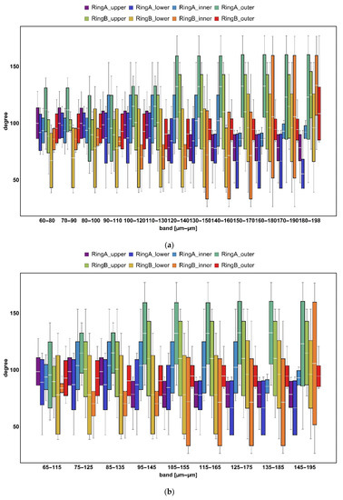 Results of bandpass filtration with three different bandwidths—20, 50, and 100 µm—of an exemplary upper surface of specimen A are depicted in Figure 5. The effect of separation of topographic features was the most evident for the narrowest bandwidth. The topographies filtered with the widest bandwidth seemed to differ the least from each other, as they contained a larger set of wavelengths that overlapped with others. This can be supported by presenting the evolution of roughness parameters with bands as a function of central wavelength. This kind of plot can be presented in linear, log-linear, or log-log scales [1,32]. In this paper, we visually demonstrated only a selected range of characterization parameters, which, by definition, describe the analyzed surface morphologies. This included arithmetic mean height (Sa) (Figure 6) and Std (Figure 7). Other calculated ISO standard parameters as a function of band are available in the supplementary materials. Rt and also Ra tended to increase as the band slid to higher wavelengths. In most engineering surfaces, when decomposed using Fourier transforms, the amplitude of the longest wavelengths is often the highest [1]. This translates to the trend of observed height amplitude parameters (Ra, Rt, Rz, Rv, and Rq for profiles as well their respective areal analogs Sa, Sz, Sv, and Sq), the values of which grow with band progression. For each band, no matter its width, two groups were visually distinctive, namely the upper surface of Ring A, the lower surfaces of both Ring A and B, and the other five surfaces. By analyzing the obtained images, it was found that the application of the mass-finishing treatment and the level of removal of the layer of surface contamination of the workpiece exposed the original material and its texture. In addition, a strong abrasive stream affected the asperities of the primary surface, forming it in a more isotropic way. By using bandpass filters, the share of a given wavelength component was limited or enhanced, and thus the functional parameters described mainly roughness. The use of filtration for the 100 µm band was characterized by more distinct valleys and softer mapping of hills. However, a 20 µm bandwidth filter showed an impact for slight changes in structure on the surface represented, in particular those related to hills. This effect was especially important when using multiscale analysis to quantify the surface condition. Different manufacturing effects could not be noted for Std. This parameter described the dominant texture direction by indicating its angle with respect to the horizontal axis (see Figure 7). For the analyzed datasets, it was found to be the least scale dependent. This suggests that any residual lay potentially resulting from hot rolling, which by definition was directional, was removed during mass-finishing, making the surfaces isotropic. As far as hybrid parameters are concerned, attention was drawn to interesting relationships related to the width of the filtration bandwidth. This effect was clearly visible, for example, for the Sdq parameter for a bandwidth of 20 µm. It should be noted that for the surfaces on ring A, there was a monotonic increase in the value of this parameter, while for isotropic surfaces (ring B) its value stabilized already at the filtration defined by the following wavelengths: LP = 110 µm/HP = 130 µm. In addition, this parameter was less sensitive to the filter bandwidth above the specified limit. The parameters from the volume and feature group showed a tendency to be monotonic as a function of the filter bandwidth and wavelength.