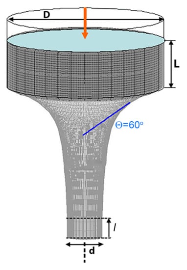 The scheme of the hot extrusion process for mathematical simulation is shown in Figure 1. In accordance with the schematic presented above, the geometrical parameters of the hot extrusion plant were set up as follows: D = 85 mm is the diameter, L = 26 mm is the length of the workpiece, and θ = 60 deg is the die rounding angle; l = 10 mm is the length and d = 30 mm is the diameter of the cylindrical section at the die output. Also, a process rate of V = 0.1 mm/s was set up. The D2/d2 parameter describes the hot extrusion process efficiency and is referred to as the extrusion ratio.
