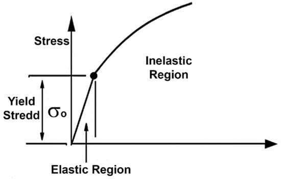 The physical and mechanical parameters of the process were chosen in accordance with earlier work []: E = 40 GPa is Young’s modulus, ν = 0.3 is Poisson’s ratio, and σo = 102 MPa is the elastic to plastic transition threshold stress. The elastic to plastic transition is illustrated in the stress vs. strain graph in Figure 2. As reported earlier [], the friction coefficient between the workpiece and the die is 0.04. The model takes the friction into account but the calculations ignored it due to the process uses graphite lining for workpiece slipping.