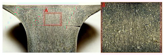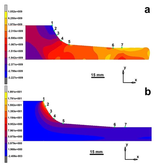 The stress distribution shown in Figure 5 suggests that at the die throat between side marks 1 and 4 the stress is negative, varying from −280 to −27 MPa which corresponds to a reduction of the tensile stress with an increase in the distance from the press position. Downstream of mark 4 the stress sign changes and the corresponding compression stress reaches approximately 75 MPa. Below marks 6–7 (at the cylindrical die section) and in the free part of the specimen, the radial stress inhomogeneity spans from 67 MPa compression (at the die wall) to 70 MPa tension (in the specimen center). The overall radial stress scatter in the specimen at the die output is about 70% of the respective scatter for extrusion of a 20 mm diameter rod. The strain distribution suggests that the greatest strain (7.0 and 14.0) is developed at the corner point of the die (Figure 5b, marks 1–2). Between marks 2 and 5 the strain decreases to 3.7. Below marks 6–7 and in the free part of the specimen, the strain decreases to 1. This section exhibits radial strain scatter corresponding to the respective changes in the stress state of this specimen section. The comparison of two variants of the die (20 and 30 mm in diameter) shows that more homogeneous strain is developed during a hot extrusion through 30 mm die.