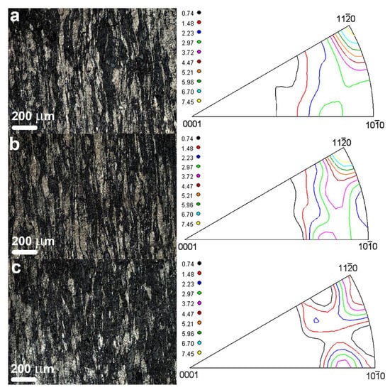 Evolution of rod texture and microstructure along extrusion axis: (a) 1 cm from die beginning, (b) 3 cm from die beginning, and (c) 5 cm from die beginning.