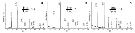 Evolution of diffraction peak intensity as a function of extrusion temperature: (a) 430 °C, (b) 450 °C, and (c) 470 °C.