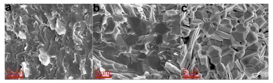 Figure 9 shows images of the cleave surface structure for solid solutions obtained at different extrusion rates. Since bismuth and antimony chalcogenide based solid solutions are cleaved mainly along their cleavage planes, their cleave surface images exhibit textures reflecting the grain structure of the material. Specimens extruded at different temperatures have almost similar sizes of structural features (about 1–5 μm). Only the cleave surface image of the specimen extruded at 470 °C shows pores (Figure 10c). These pores can be seen both along the grain boundaries and inside the grains. Pore formation at this extrusion temperature can be accounted for by coagulation of point defects and/or changes in stoichiometry due to tellurium evaporation.