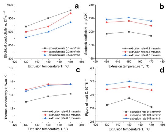 As can be seen from the data presented in Figure 10, an increase in the extrusion temperature leads to an increase in the electrical conductivity of the solid solutions. At each experimental extrusion temperature, the electrical conductivity of the solid solutions decreases with an increase in the extrusion rate. The Seebeck coefficient increases slightly with an increase in the extrusion temperature from 430 to 450 °C and decreases noticeably with an increase in the extrusion temperature to 470 °C. The dependence of thermal conductivity on the extrusion temperature correlates well with the electrical conductivity curves. The minimum value of thermal conductivity has a sample obtained at an extrusion rate of 0.1 mm/min. This is explained by the fact that at a low value of the extrusion rate, the compaction process proceeds with the formation of many structural defects. The thermal conductivity of the samples obtained at an extrusion rate of 0.3 and 0.5 mm/min practically does not differ at comparable extrusion temperatures. At comparable extrusion temperatures, the Seebeck coefficient increases with an increase in the extrusion rate. The thermoelectric figure of merit changes nonmonotonically with an increase in the extrusion temperature and has a clear peak at a 450 °C extrusion temperature. Similarly, the Seebeck coefficient changes in Figure 10b. An increase in the extrusion rate leads to an increase in the thermoelectric figure of merit. The specimens extruded at 450 °C with a 0.5 mm/min extrusion rate have the highest thermoelectric figure of merit (Z = 3.2 × 10−3 K−1).
