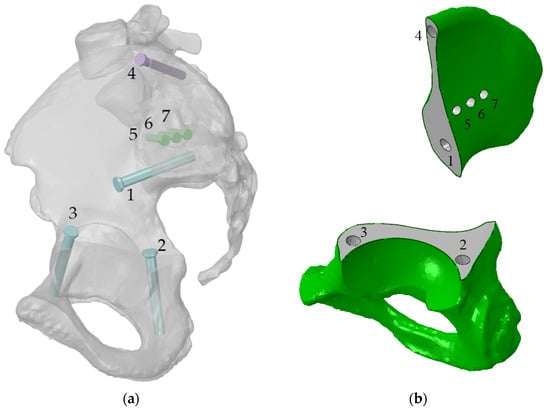 Implant fixation: (a) the screws numbered from 1 to 7 and their positions (the implant is hidden); (b) the holes numbered from 1 to 7 in the bone parts, the same numeration as this for the screws.