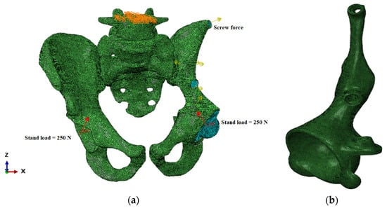 Finite element model of the “bone–endoprosthesis” system: (a) finite element mesh on the pelvis; (b) finite element mesh on the implant.