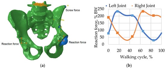 Boundary conditions and applied forces: (a) model with boundary conditions and loads including screw pretension and reaction forces applied to the centres of the left and right joints; (b) reaction force curves for walking simulation measured as a percentage of body weight (BW).
