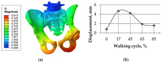 Total displacement in the “bone–endoprosthesis” system for the walking condition and a screw load of 1000 N: (a) typical displacement distribution (mm); (b) displacement values for the full gait cycle at the spherical center of the left femoral head.