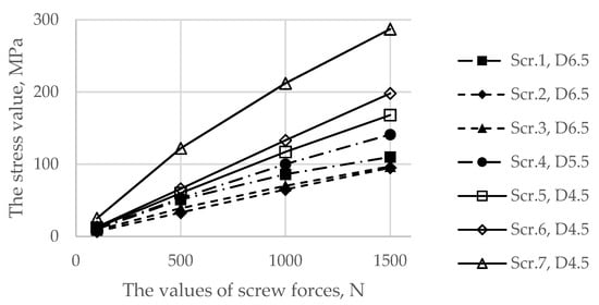 The first step in the assessment of the long-term strength and reliability of the biomechanical “bone–endoprosthesis” system is to evaluate the mechanical strength of the implant and its fixation system. According to Figure 7, the stresses occurring in the screws vary mostly linearly depending on the applied pretension force. This finding allows us to obtain the required force in a relatively simple way. The high stresses are distributed quite locally. The highest stress level takes place in the areas of contact between the screws and the screw holes in the implant (Figure 8) and the bone tissue (Figure 10).