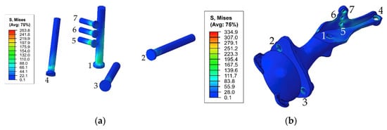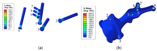 As shown in Figure 8 and Figure 9, the maximum von Mises stress values that occurred in screw 7 and holes 4 and 7 in the case of a pretension force of 1500 N were close to the ultimate stresses according to Table 2. A significant change in the stresses took place near the holes, as shown in Figure 10, while the remaining volume of the bone was almost free from the stresses.