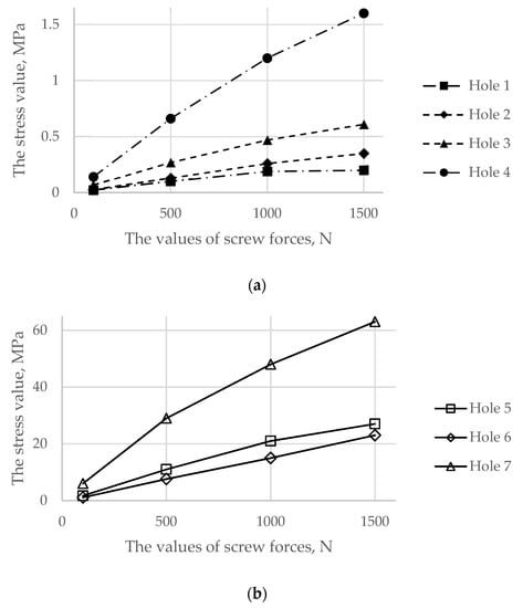 Particular attention should be given to the stresses in the pelvic bones because the destruction of the bone might be initiated due to the high value of the screw force. Figure 9 represents comparative graphs of the maximum stress values arising in the spongy (a) and cortical (b) layers in the first row of the finite elements of holes 1, 2, and 3 in the spongy tissue and holes 5, 6, and 7 in the cortical tissue.