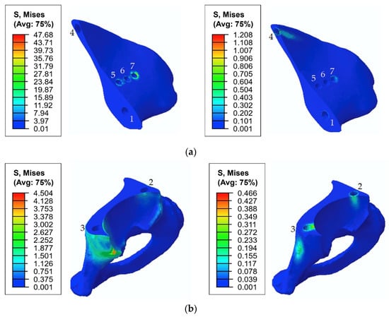 Equivalent von Mises stress (MPa) distribution in the bone tissue caused by a pretension load of 1000 N: (a) the upper part of the resected pelvic bone; (b) the lower part of the resected pelvic bone. The images on the left show the stresses in the cortical tissue, and the images on the right show the stresses in the spongy tissue.