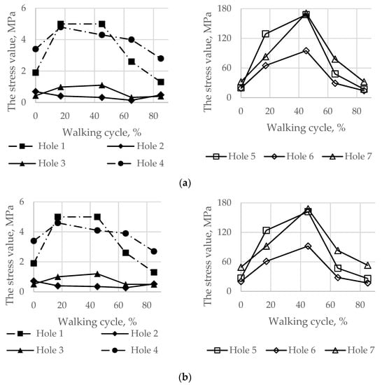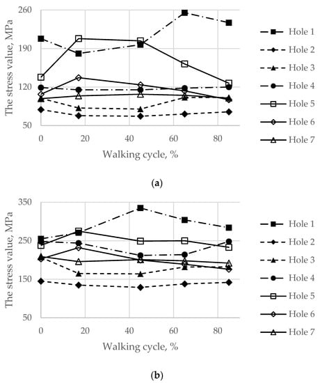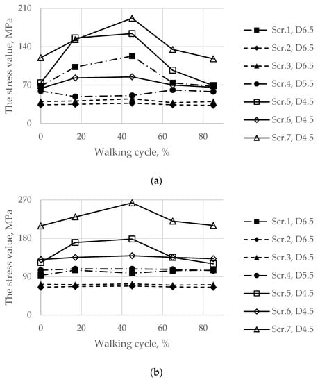 Finally, the maximum von Mises stresses evaluated on the boundaries of the holes for the screws at every load point in the walking cycle are shown in Figure 14.