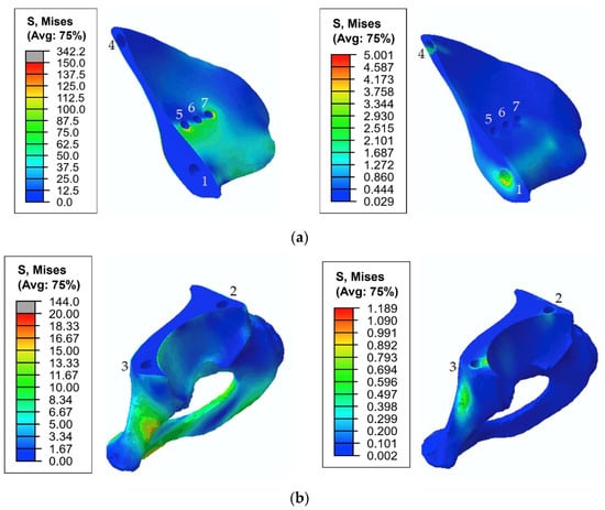 Equivalent von Mises stress (MPa) distribution in the bone tissue caused by the pretension load of 1000 N and joint reaction forces at 45% of the gait cycle: (a) the upper part of the resected pelvic bone; (b) the lower part of the resected pelvic bone. The images on the left show stresses in the cortical tissue, and the images on the right show stresses in the spongy tissue.