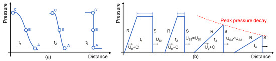 Graphical representation of: (a) the shockwave formation; (b) the propagation and attenuation of the shockwave, where S is the shock front and R is the release part of the shock, US is the shock front velocity, UP is the particle velocity and C is the sound velocity at a particular pressure.