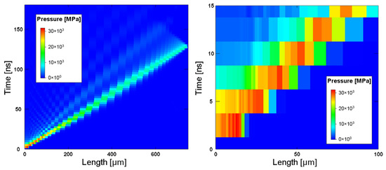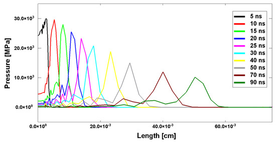 This feature is particularly relevant when dealing with shockwaves generated by laser pulses. As highlighted by the results reported in Figure 2, which belong to a hydrodynamic simulation of a laser-induced shockwave propagation, the wave has a triangular shape with the release part just behind the shock front; therefore, the peak begins to be attenuated almost immediately.