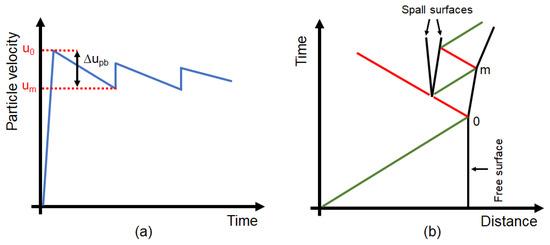 (a) Representation of the free surface velocity history. (b) Distance–time diagram of the compressive (green) and tensile (red) waves trajectories.