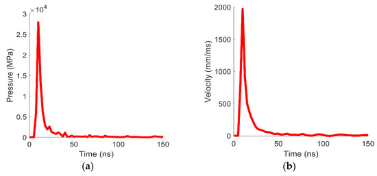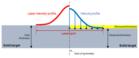 The radius of each modelled specimen was 4 mm, while the thickness varied according to the target thickness of the different shots and to the data coming from Helios. In fact, since the phenomena that take place during the laser deposition phase can only be simulated in Helios and are not reproducible with LS-Dyna, the FEM simulation has to start after the deposition phase. Indeed, the shockwave produced by the laser–matter interaction travels until a certain depth during the laser action, and hence the LS-Dyna model has to neglect the thickness travelled by the shockwave in the first 5 ns as shown in Figure 4. For this reason, this thickness is removed from the total thickness of the samples in LS-Dyna. This removed part always ablates or at least melts, whereas the aim of the LS-Dyna simulation is that of reproducing the behaviour only of the solid part.