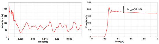 Axial velocity of the node at radius = 0 mm on the rear surface. The figure on the right is a portion of the left one.