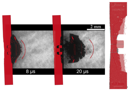 From Figure 7, it appears clearly that the radial size as well as the shape and speed of the ejected fragment is correctly predicted by the model. Indeed, due to the element erosion criteria implemented in the material model some debris behind the main fragment were deleted by the computation; however, the comparison between the thicknesses of the main fragment of the simulation and of the experiment is not easy with just the shadowgraphies. Probably, the second compact spalled object could not be simulated because of the erosion criteria. However, the higher displacement of the unbroken part of the experimental target might be partly associated with the displacement of the sample holder, which was not simulated in LS-Dyna.