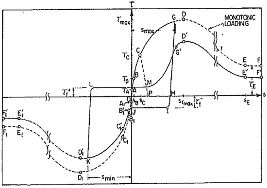 Under cyclic loading, the degradation of bonding behavior is more severe than that under monotonic cyclic loading. The degradation becomes more significant with larger slip value at which reversal of loading occurs. Ismail and Jirsa [7] found that application of load cycles with constant peak stress can yield gradual deterioration in bonding even with a small number of repetitions. Eligehausen et al. [8] carried out an experimental study to investigate the bond stress–slip relationship under cyclic loading with an extensive list of variables. They showed that the envelope of bond stress–slip hysteresis loops for repeated loading lies below the curve from monotonic loading, as shown in Figure 1. Gan listed the most important parameters under cyclic loading as follows: strain (or stress) range, type and rate of loading (strain rate), and the value of maximum imposed bond stress [10]. Based on the test results, the bond stress–slip models were proposed according to two basic approaches: (1) microscopic approach reflecting the local stress state between concrete and rebars [11,12], and (2) a macroscopic approach simulating the global behavior of a member [13,14,15].