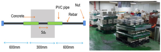 The embedded length (5db) was secured in the middle of the reinforcement guided by two PVC pipes of which openings were later sealed with silicone to prevent intrusion of concrete into the pipe during concrete placement, as shown in Figure 3. Other parts of reinforcement were sprayed with WD-40 (Water Displacement 40th formula by WD-40 Company, San Diego, CA, USA) to prevent corrosion. After the concrete placement, all specimens were cured in moist condition for up to 28 days.