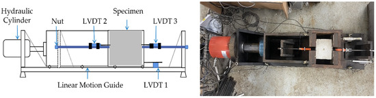 The testing machine shown in Figure 4 was used for cyclic load test. The loading device was designed to exert the load on the specimen in two different modes: displacement control or load control. The double acting hydraulic cylinder with 200-tonf capacity at pressure of 700 bar was manufactured by a local company (TDC-20015 by Daejin Hydraulic Machinery Co., Ltd., Busan, Korea). A low-profile load cell with a 20-tonf compression and tension measurement range, manufactured by a local company (Bongshin Loadcell Co., Ltd., Osan, Korea), was used to measure applied load. Two linear displacement transducers (CDP-50M by Tokyo Measuring Instruments Lab Co., Ltd., Tokyo, Japan) were used to measure local slip as shown as LVDT2 and LVDT3 in Figure 4. An additional linear displacement transducer, LVDT1, was installed on the base plate to monitor the global displacement of the specimen holder. All measurements were recorded using a data logger (UCAM-60B by Kyowa Electronic Instruments Co., Ltd., Tokyo, Japan) at one second intervals.