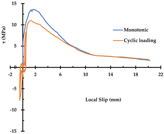 The effect of cyclic loading on the pullout behavior of the rebar is shown in Figure 5. The cyclic loading reduced the maximum bond stress and corresponding slip by 19% and 8%, respectively, compared to those of the specimen subjected to a simple monotonic loading. It is noted that two curves become essentially identical beyond a slip value of 7 mm, corresponding to the frictional resistance branch. The area under the bond stress–slip curve up to the maximum bond stress was 41% smaller in the cyclic loading case than that of the monotonic case. Meanwhile, the area under the entire curve was 14% smaller in the cyclic loading case than that of the monotonic case, indicating that the low-level cyclic loading affects the pre-peak bond–slip behavior more than the post-peak.
