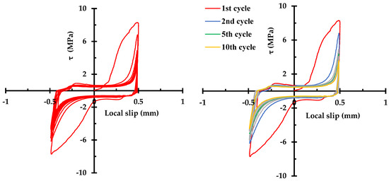 Bond stress–slip curve: all 10 cycles are shown (left), selected cycles shown to accentuate the effect of the cyclic load on the bond stress–slip behavior (right).
