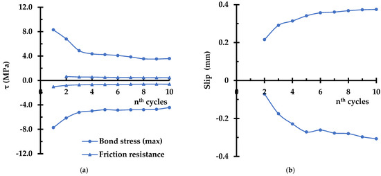 The general shape of the descending branch is retained for the subsequent load cycles (second to tenth), though it is noted that there is no inflection point in the ascending branch. The absence of the inflection point in the ascending branch suggests that the slip-resistant mechanism is consolidated to a single mode after the first load cycle. As can be seen in Figure 7a, the maximum bond stress (τm) and the bond stress corresponding to the frictional resistance (τf) show significant degradation (41% and 30%, respectively) in the first three cycles, and approach asymptotic values with final degradation of 57% and 41% at the tenth cycle, with respect to those of the first cycle. Furthermore, it is noted that frictional resistance is always lower in positive direction than in negative direction by 21% on average. Figure 7b also shows asymmetry of the frictional plateau. The directionality of the bond–slip behavior seems to be an inevitable phenomenon as the degradation is not likely to occur uniformly over the lug of the deformed bar.