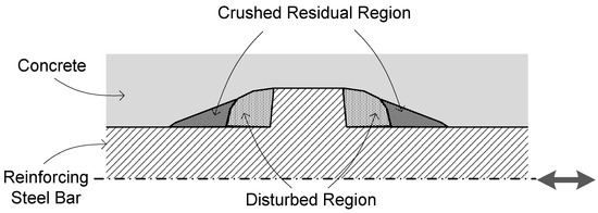 Disturbed and crushed residual regions surrounding steel bars during cyclic loading.