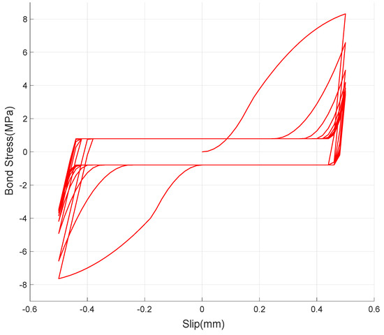 Full 10 cycles as in the experiment are simulated and the numerical result is plotted in Figure 11. It can be observed that the result appropriately simulates the experimental bond–slip behavior discussed in Section 2. To evaluate the reproduction capability of the presently suggested numerical model, the first two cycles are closely compared in Figure 12. It is shown that the numerical model realistically represents the pre-damaged bond behavior by providing the initial damage on stiffness. It is also verified that the evolution of the damaged bond–slip boundary, , and the peak bond stress, , during the second loading path is appropriately reproduced.