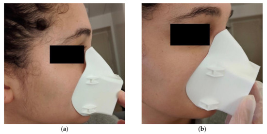The first mask iteration was 3D printed in 1.75 mm PLA filament on a Monoprice MP Select Mini 3D Printer with 25% infill and 0.175 mm layer thickness. This first mask was tested by one of the authors in their home to determine the viability of the hot water method. To mold the mask, we start by preparing hot water to about 70 °C to reach the glass transition temperature of PLA. The face edge of the mask is dipped in the hot water for 10–15 s to soften. The mask is then immediately placed on the user’s face where they use their fingers to adjust the fit, taking care around the nose area in particular. The process can be repeated as needed. As shown in Figure 2, this method allows adjustment of the mask contour to better fit the person’s face.