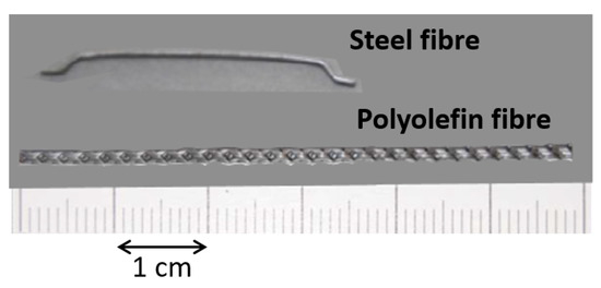 In order to perform the present research, two formulations of concrete were used. The first formulation was a conventional concrete, termed VCC-PFRC4.5, which included 4.5 kg/m3 of polyolefin fibres. The second formulation was a self-compacting concrete, called SCC-SFRC50, where 50 kg/m3 of hooked-end steel fibres were added. VCC-PFRC4.5 and SCC-SFRC50 boasted a volume fraction of fibres of 0.49% and 0.64%, respectively. The characteristics of the steel and polyolefin fibres can be seen in Table 1. Similarly, the outlook of such fibres can be seen in Figure 1.