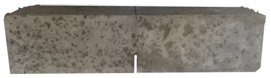 The prismatic specimens were prepared for the flexural fatigue tests according to RILEM TC-187 [32]. A notch of a third of the ligament depth was performed on the central section of the prismatic specimens. In order to avoid introducing any damage in the material, the notches were carried out by using a water-cooled circular saw equipped with a diamond disc. An image of one of the specimens can be seen in Figure 2.