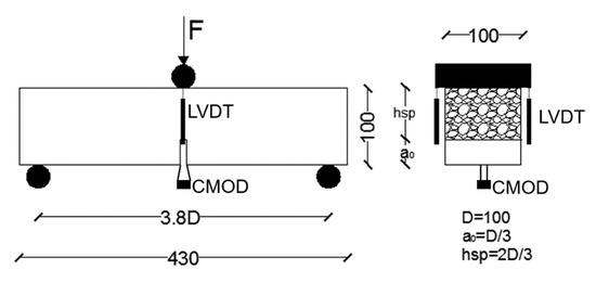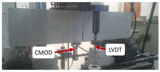 The tests were carried out with an Instron 8803 testing machine (Instron, Buckkinghamshire, UK) of 500-kN capacity. The crack mouth opening displacement (CMOD) was measured by means of a clip-on gauge device attached to the lips of the notch. Regarding the deflection, two linear variable differential transformers (LVDT) were placed at both sides of the notch of the tested specimen. During the tests, the following data were registered: position of the actuator, the applied load, the CMOD opening, and the deflection at both sides of the sample. An image of a specimen while testing can be seen in Figure 4.