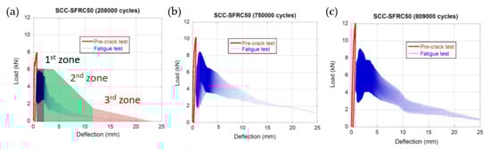 Fatigue behaviour of SCC-SFRC50 specimens pre-cracked at fR1: (a) specimen collapsed after approximately 208,000 cycles, (b) specimen collapsed after approximately 750,000 cycles, and (c) specimen collapsed after approximately 809,000 cycles.