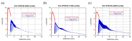 Fatigue behaviour of SCC-SFRC50 specimens pre-cracked at fR3: (a) specimen collapsed after approximately 8000 cycles, (b) specimen collapsed after approximately 11,000 cycles, and (c) specimen collapsed after approximately 35,000 cycles.